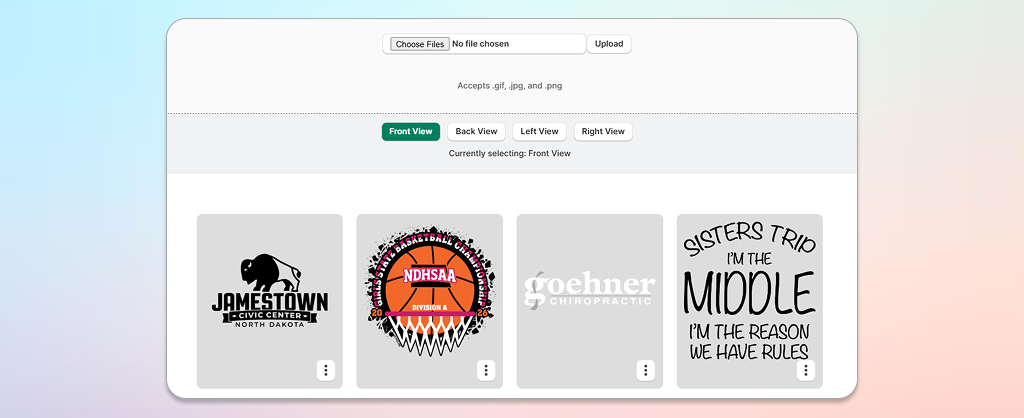 • Multi-View Product Customization: Customers select designs from the library and apply artwork across front, back, left, and right views with real-time rendering, ensuring accuracy across colors and sizes.