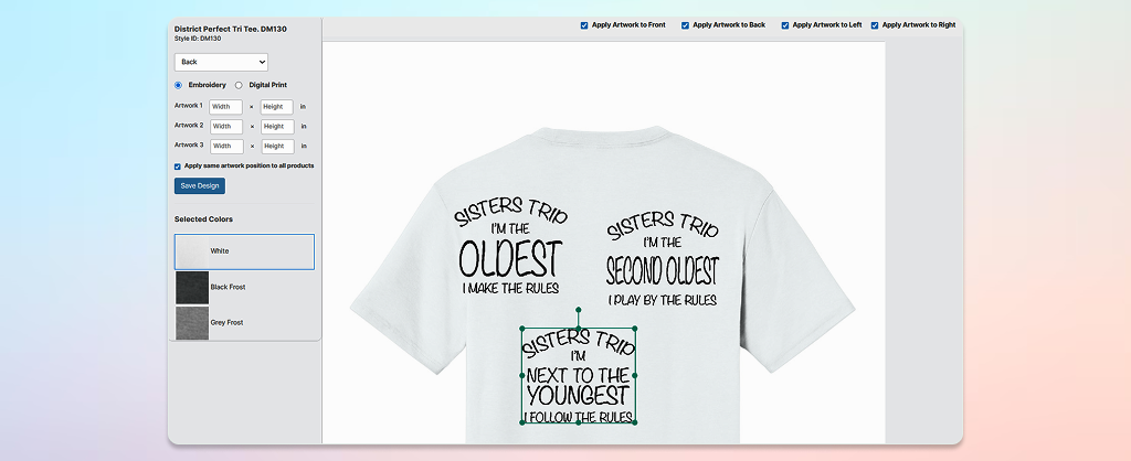 • Artwork renders in real time across colors and sizes, ensuring accuracy.