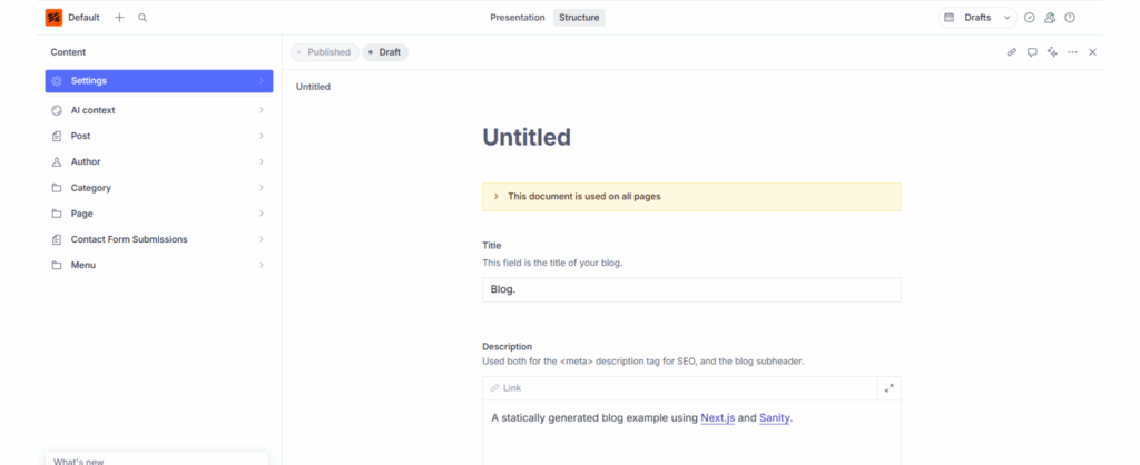 • Configured Schemas for Content Types: Created custom schemas for posts, categories, authors, media, etc. Sanityโ€™s flexible system makes it easy to structure content your way.