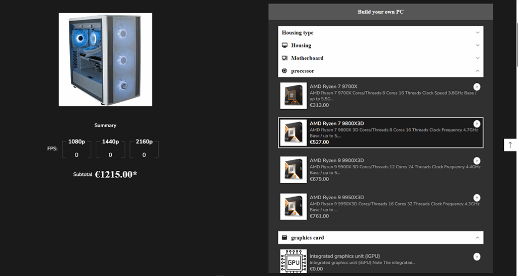 - The custom product builder offers multiple options for each componentโbased on performance, price, and use case (gaming, workstations).